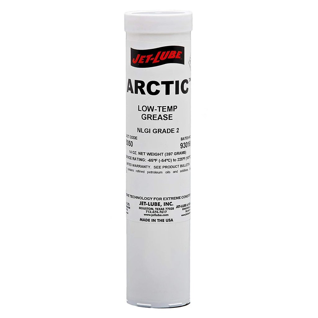ARCTIC 14 OZ. CARTRIDGE is an excellent service grease with an extreme temperature range, allowing it to resist cold without deterioration of the lubricating properties and still withstand summer or other high temperatures. It will resist such environmental contact as humidity, ice and road salts without hardening, washing off or deteriorating. ARCTIC is an anhydrous, calcium 12- hydroxystearate grease with a dropping point of 285°F (141°C). It contains no solid additives such as graphite, moly disulfide, or zinc oxide. It also passes the application salt-spray-resistance and rust tests required by the United States Government for its severe environmental contact greases.